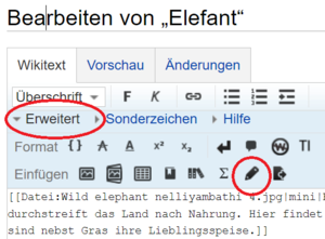 Der Visual Editor wird standardmäßig aufgerufen, wenn man eine Seite bearbeitet. Man kann aber auch wechseln und stattdessen den Quelltext-Editor verwenden. Im Visual Editor wechselt man mit dem Stiftsymbol, das gleich neben dem blauen Feld mit „Änderungen speichern” steht. Es ist außerdem möglich, von Anfang an den Quelltext-Editor aufzurufen, nämlich mit dem Symbol mit den drei Punkten (dort: „Quelltext bearbeiten“).